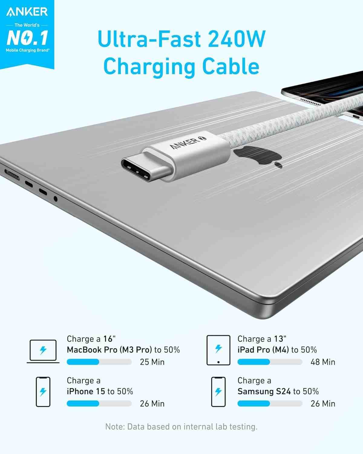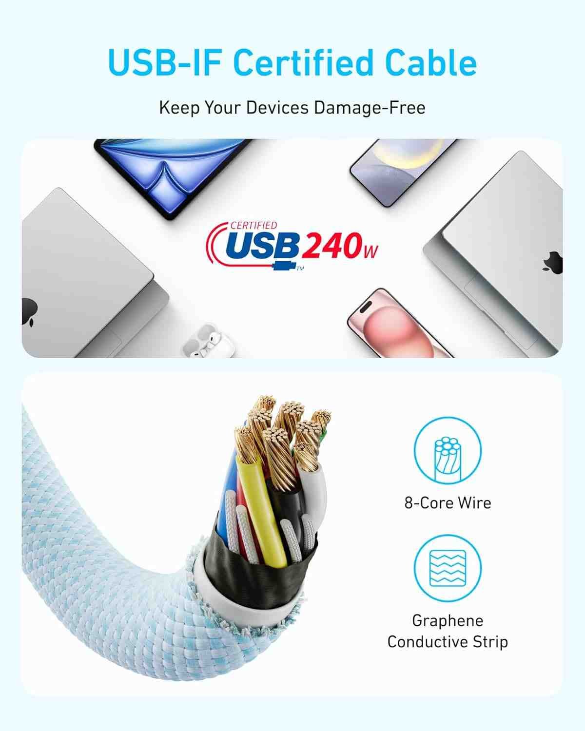 The Anker Zolo USB-C to USB-C Data Cable (1.5 meters, 240W, braided) is built for next-generation fast charging and high-speed data transfer. With PD 3.1 support, this cable can deliver up to 240W power, making it ideal for MacBook Pro, iPad Pro, flagship smartphones, and high-performance laptops.